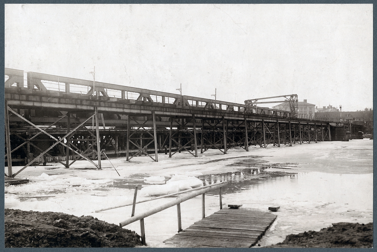 Montering av överbyggnaden på järnvägsbron över Stångån vid Linköping.