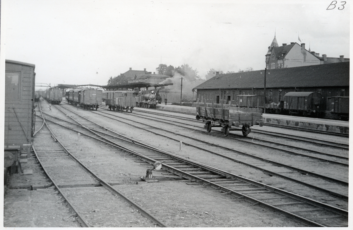 Godsmagasin med stationshuset i bakgrunden vid Örebro Central.