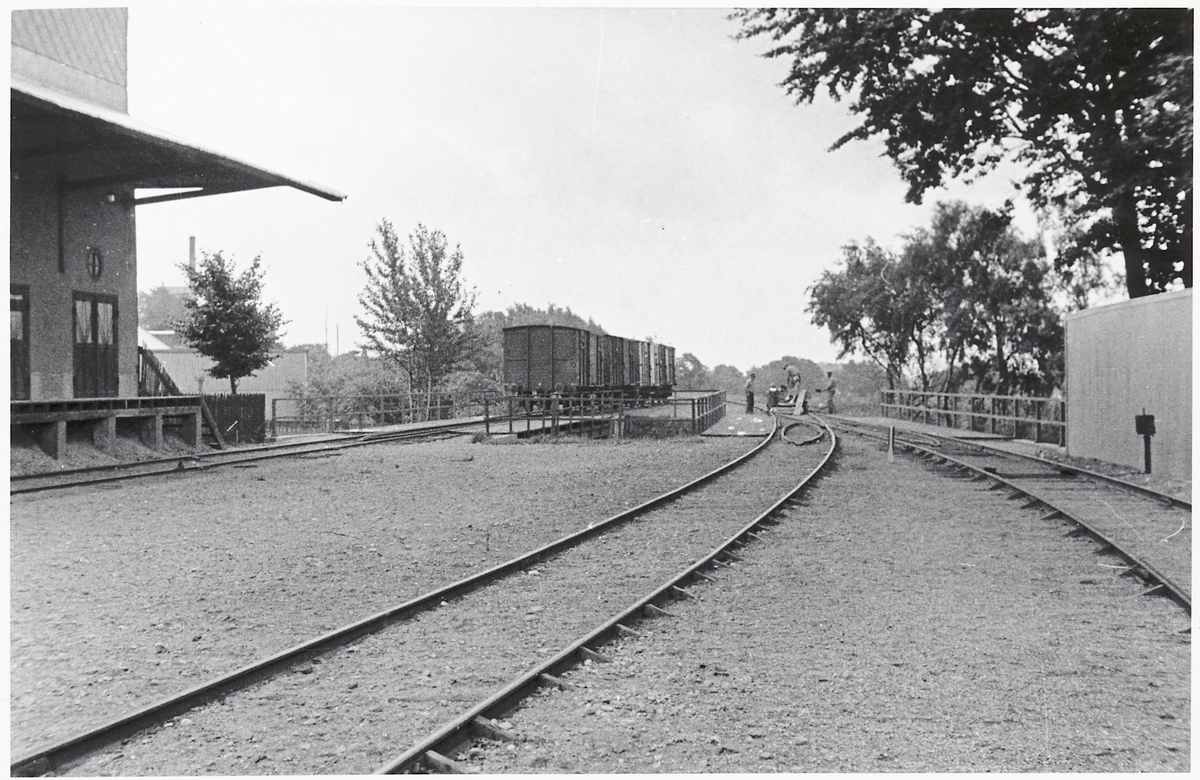 Arbete pågår i utefter bangården i Eslöv. Till vänster i bild syns ett lagerhus som användes för spannmål under krigsåren.