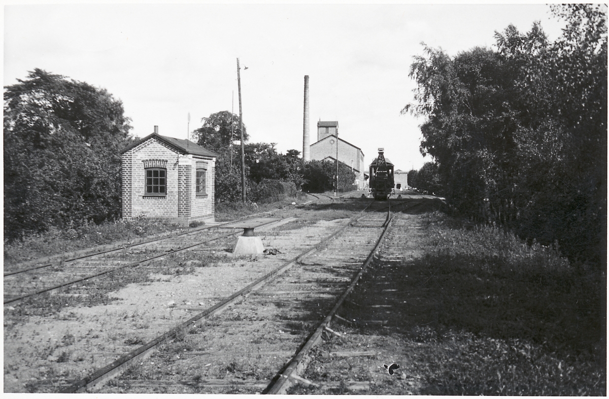 Spårområde utanför saftabriken i Eslöv. På bilden ses ett våghus och flera spelverk. Fordonet är en ångkran.