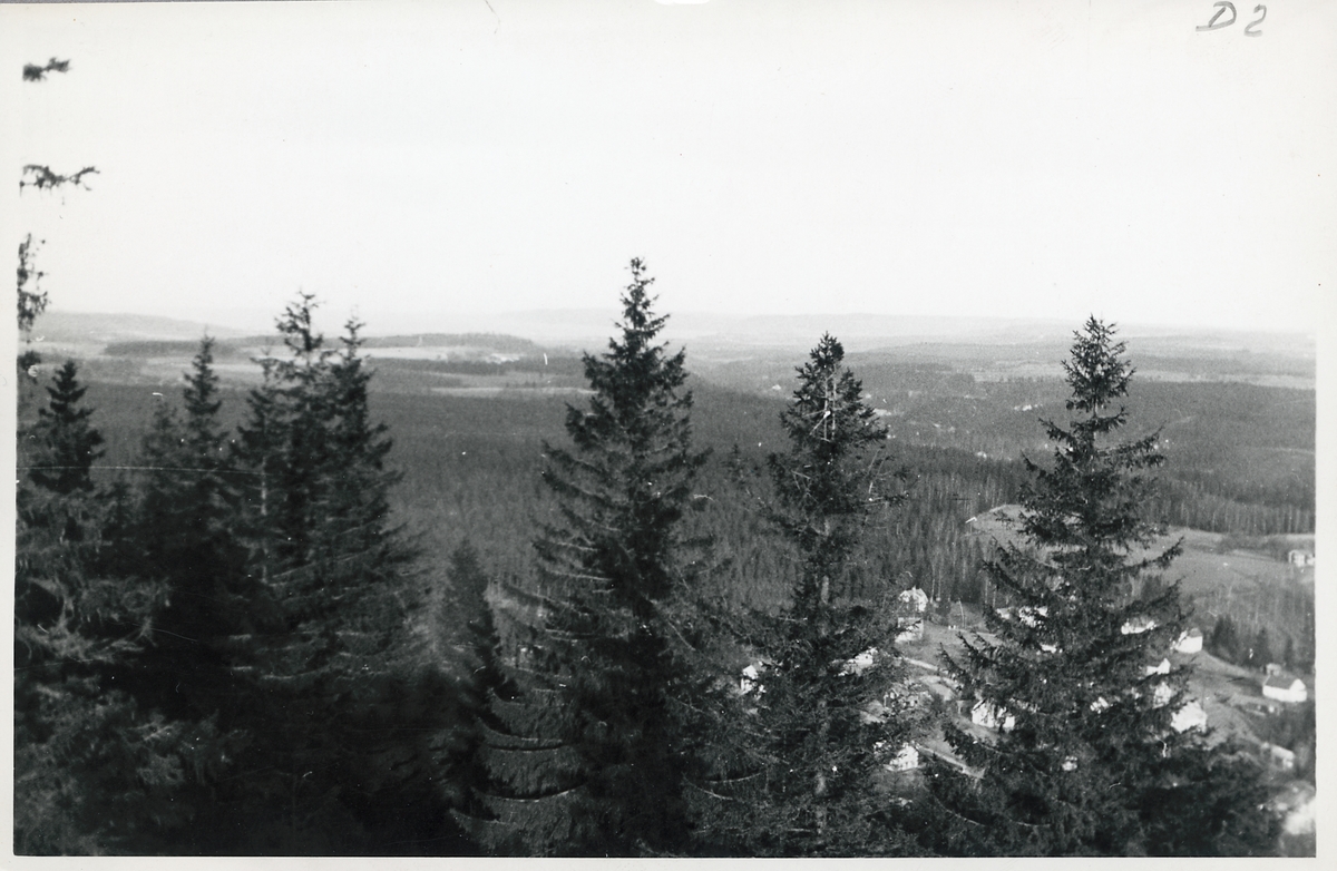 Utsikt från toppen av Taberg i Småland, vi skymtar Smålands Taberg genom träden.