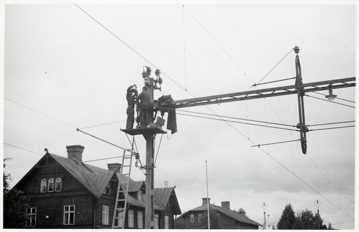 Kontaktledningsarbete i Jörn framför järnvägshotellet och stationshuset.
