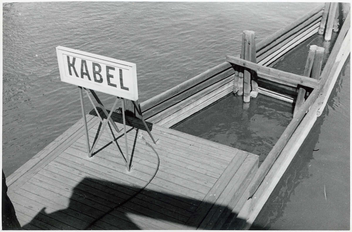 Skylt som varnar för kabel på älvbotten vid Marieholmsbron.