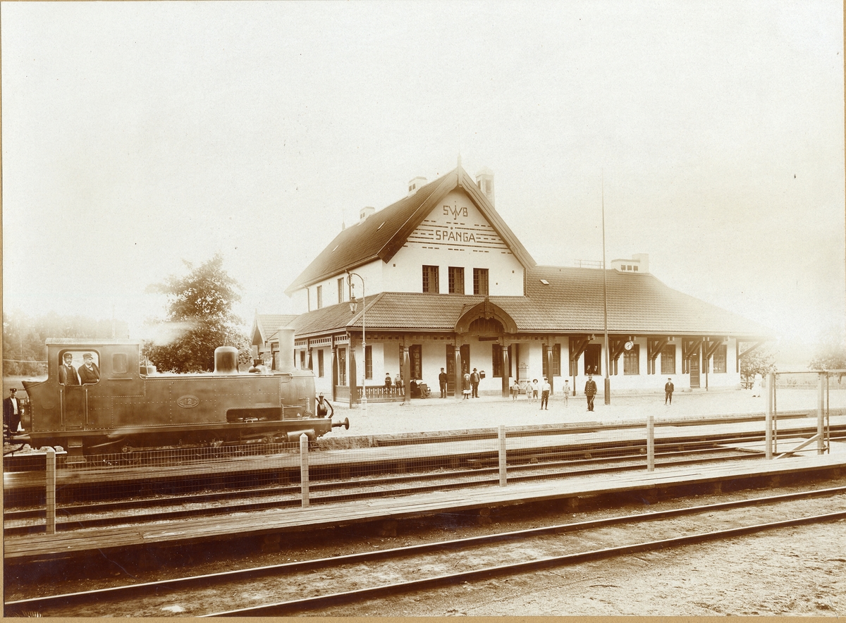SWB L/V 12 i Spånga 1913. Lokeldare Gustaf Oskar Danielsson f 31/8 1882. Lokförare Gustaf Hjalmar Forss f4/6 1880 d22/6 1961. Vid flaggstången Stationsmästare Måns Nilsson