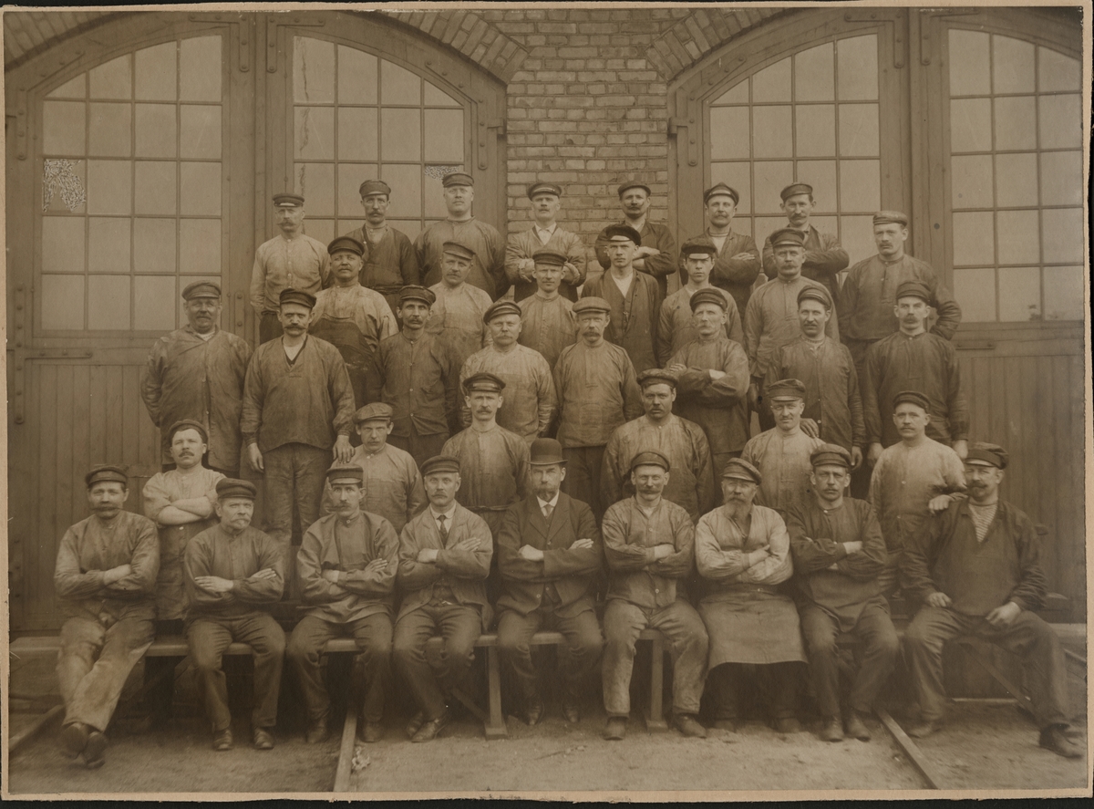 Verkstadspersonal vid ett av bolagen som senare blev Trafikaktiebolaget Grängesberg - Oxelösunds Järnvägar, TGOJ.