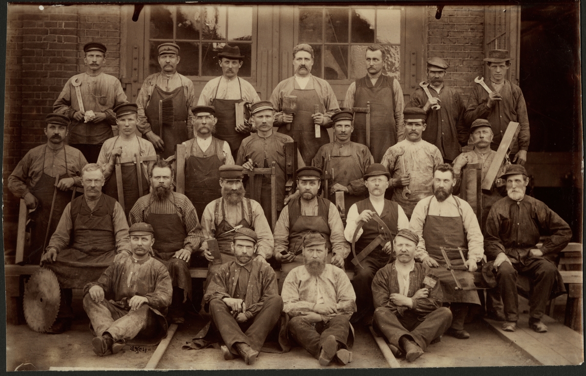 Titel: Verkstadspersonal vid ett av bolagen som senare blev Trafikaktiebolaget Grängesberg - Oxelösunds Järnvägar, TGOJ.