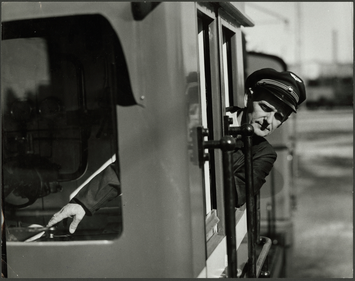 Lokförare lutar sig ut från Trafikaktiebolaget Grängesberg - Oxelösunds Järnvägar, TGOJ Ma 404.