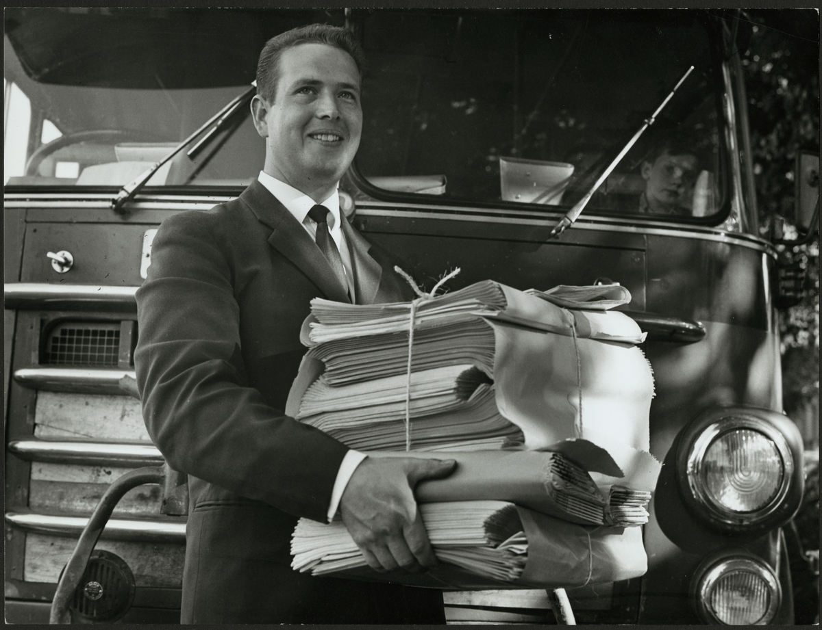 Bengt Filipsson, Eskilstuna, framför en Trafikaktiebolaget Grängesberg - Oxelösunds Järnvägar, TGOJ buss.