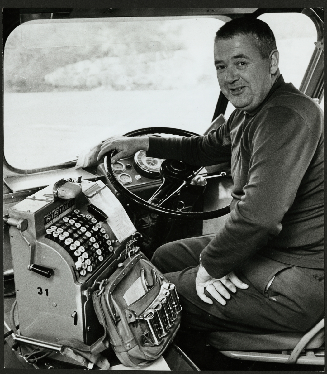 Busschaufför i en Trafikaktiebolaget Grängesberg - Oxelösunds Järnvägar, TGOJ buss.