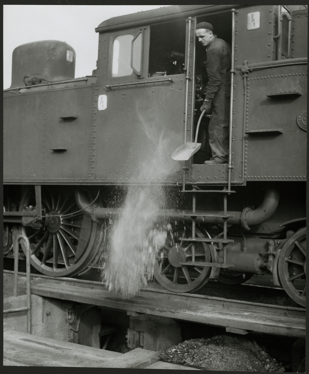 Tömning av aska från ett Trafikaktiebolaget Grängesberg - Oxelösunds Järnvägar, TGOJ ånglok.