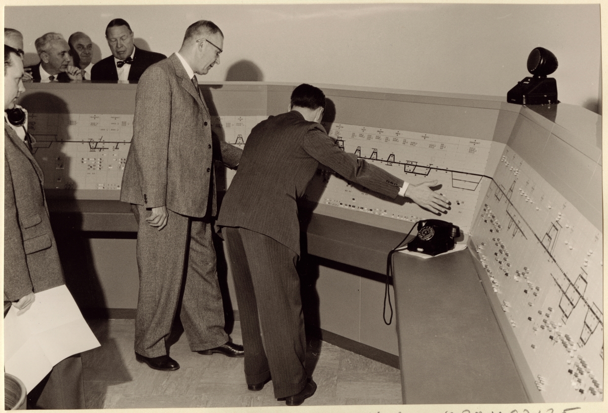 Signalingenjör Gösta Knall ger en demonstration av Trafikaktiebolaget Grängesberg - Oxelösunds Järnvägar, TGOJ CTC fjärrstyrning i Skogstorp under invigningen.