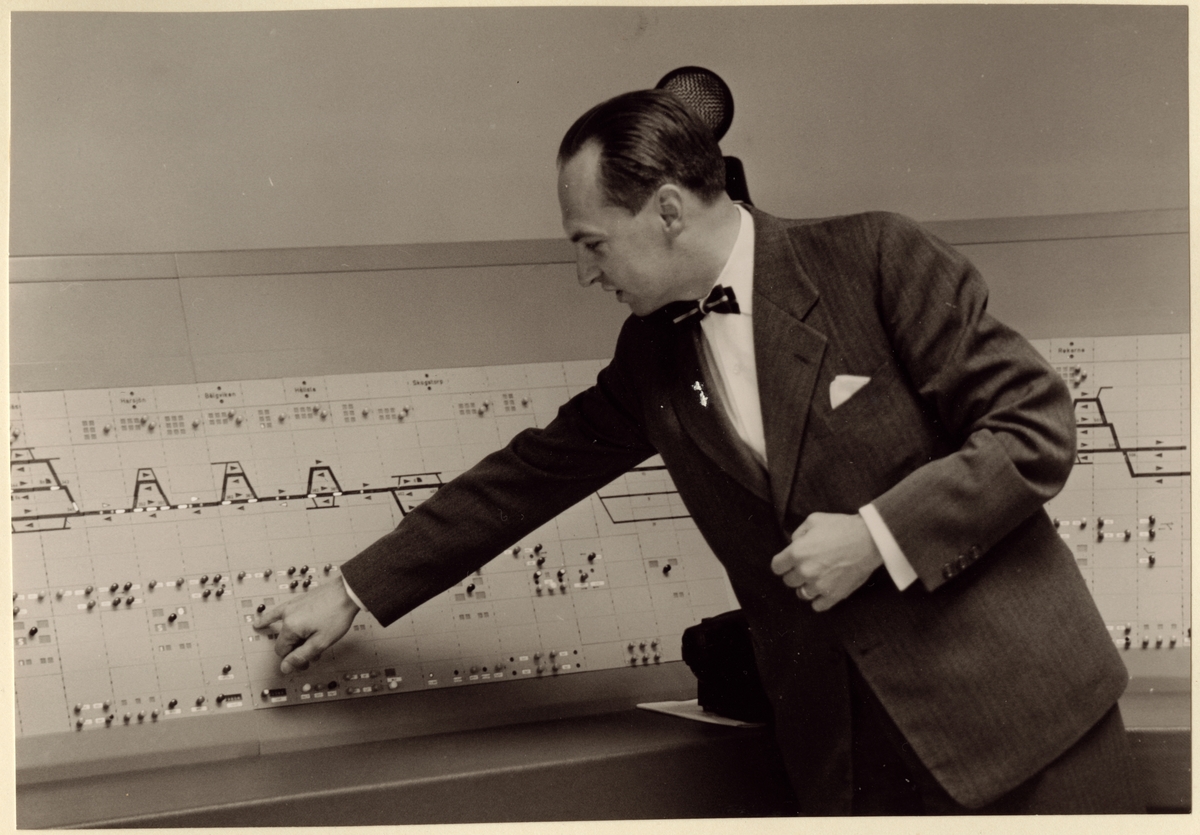 Signalingenjör Gösta Knall ger en demonstration av Trafikaktiebolaget Grängesberg - Oxelösunds Järnvägar, TGOJ CTC fjärrstyrning i Skogstorp under invigningen.