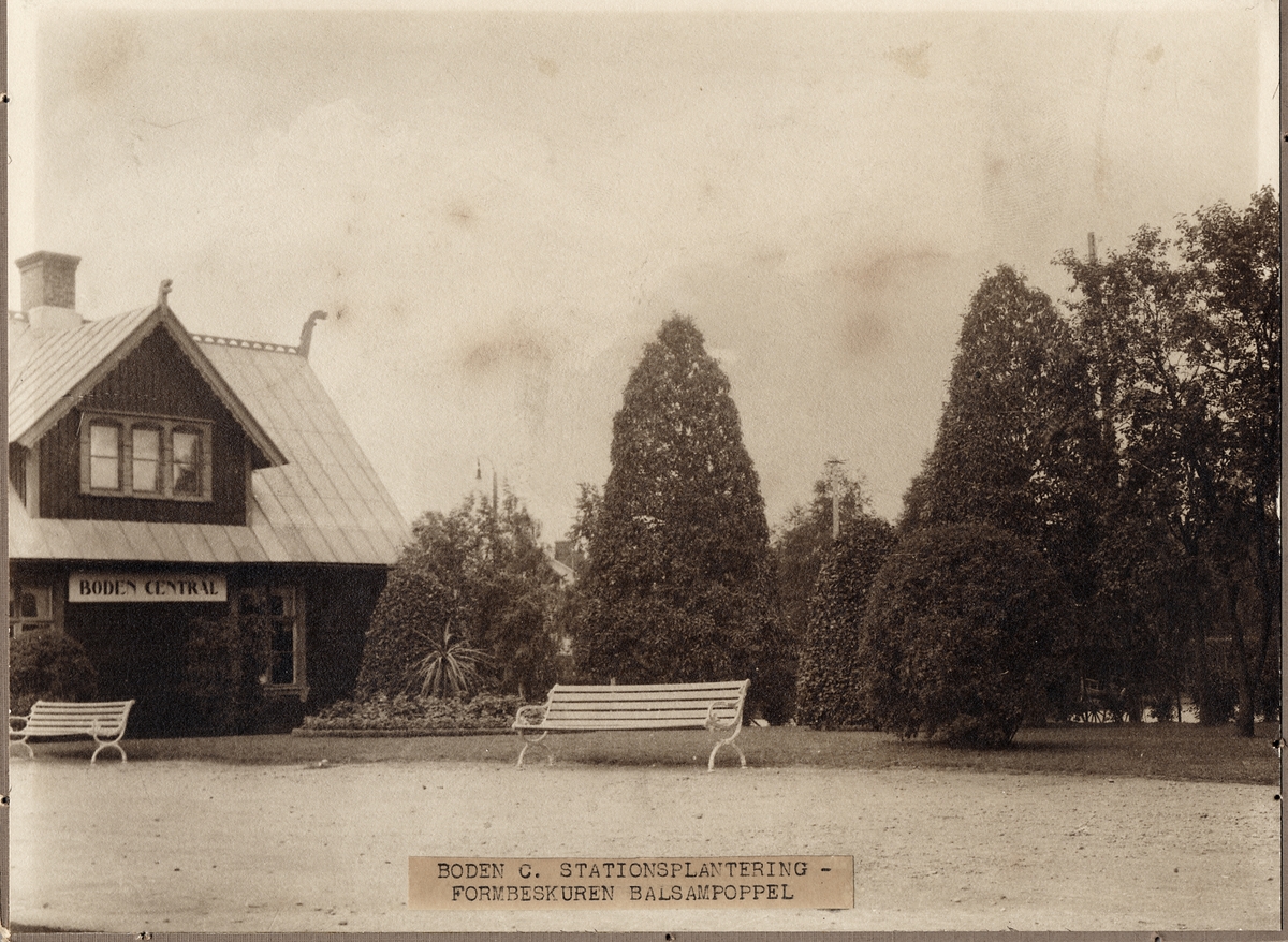 Boden Central. Stationsplantering. Formbeskuren Balsampoppel. Fotografiet troligtvis taget av trädgårdsdirektör Enok Cederholm på 1920 talet.
