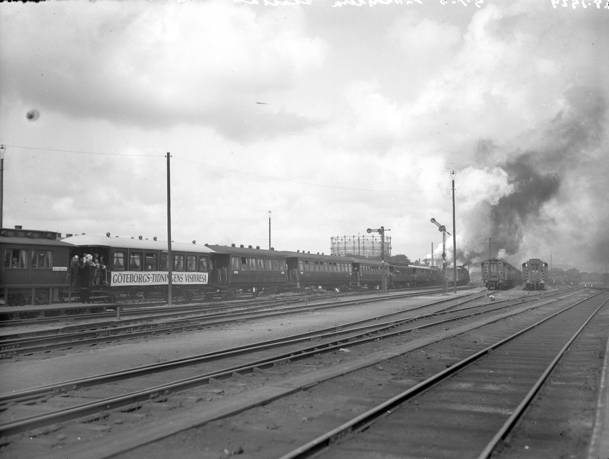 Handelstidnings extratåg (GBJ) till Varberg. På vagnen en banderoll med texten Göteborgs-tidningens Visbyresa.