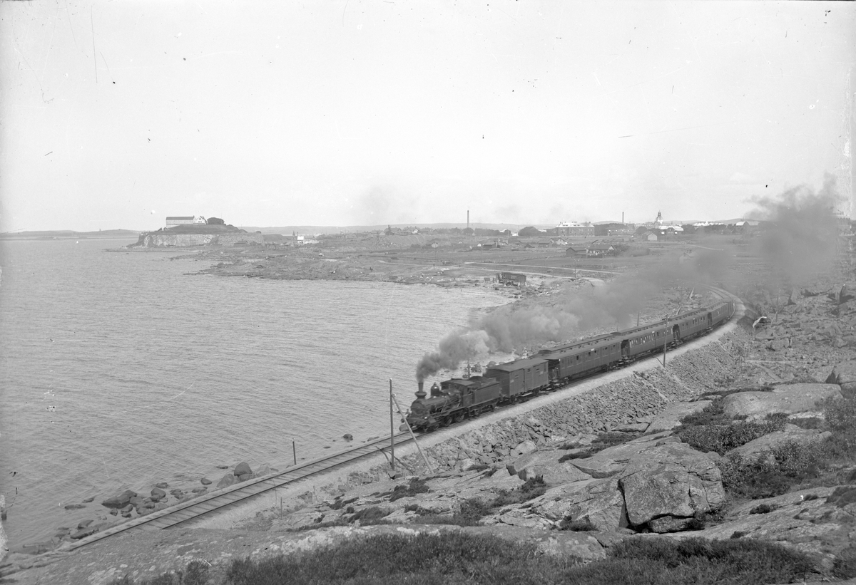 Statens Järnvägar, SJ Da-lok med tåg. Varbergs fästning i bakgrunden.