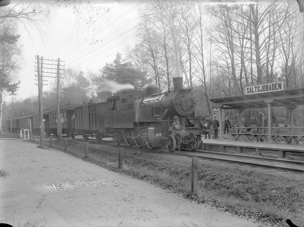 Persontåg med Malmö - Ystads Järnvägs, MYJ, lok 35 som dragkraft gör uppehåll vid Ystads Saltsjöbad.