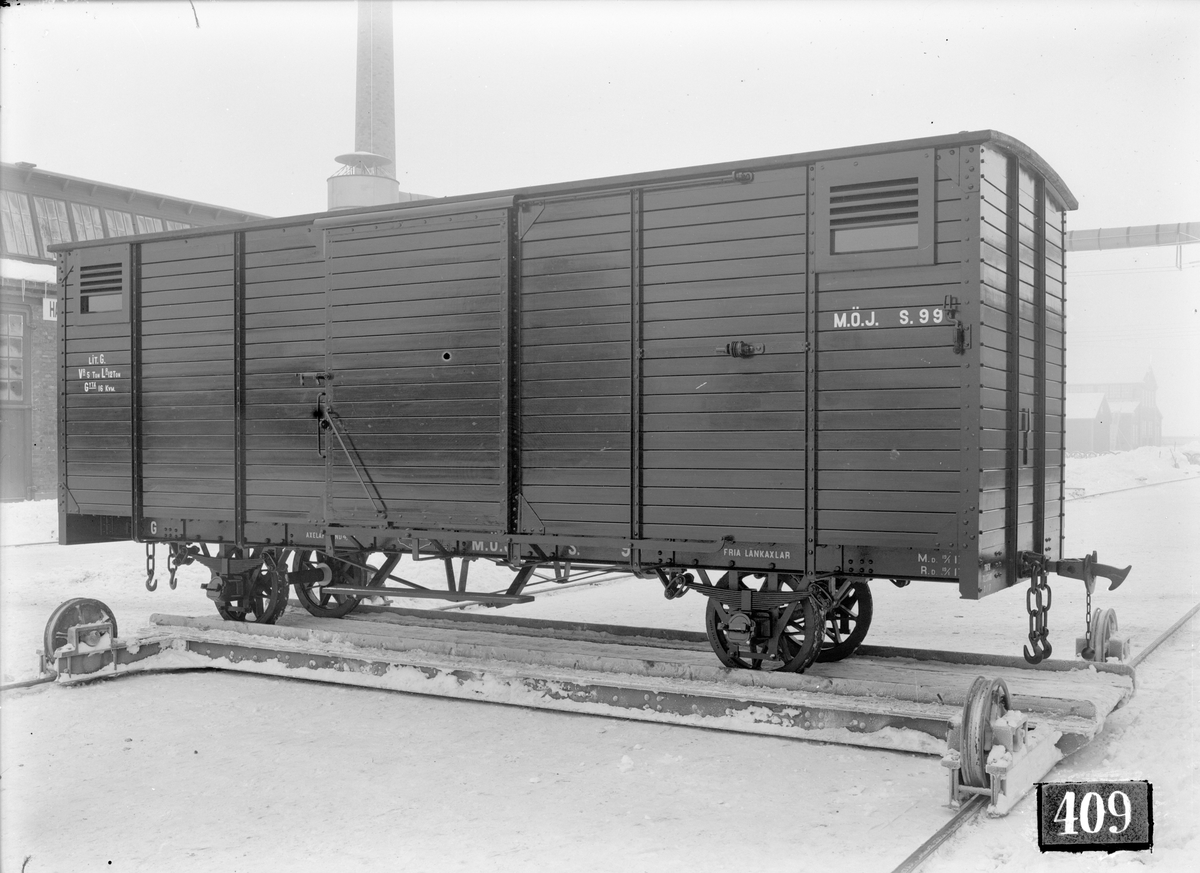 Mellersta Östergötlands Järnväg, MÖJ G S99. Vagnen står på en marktravers. Aktiebolaget Svenska Järnvägsverkstäderna, ASJ.