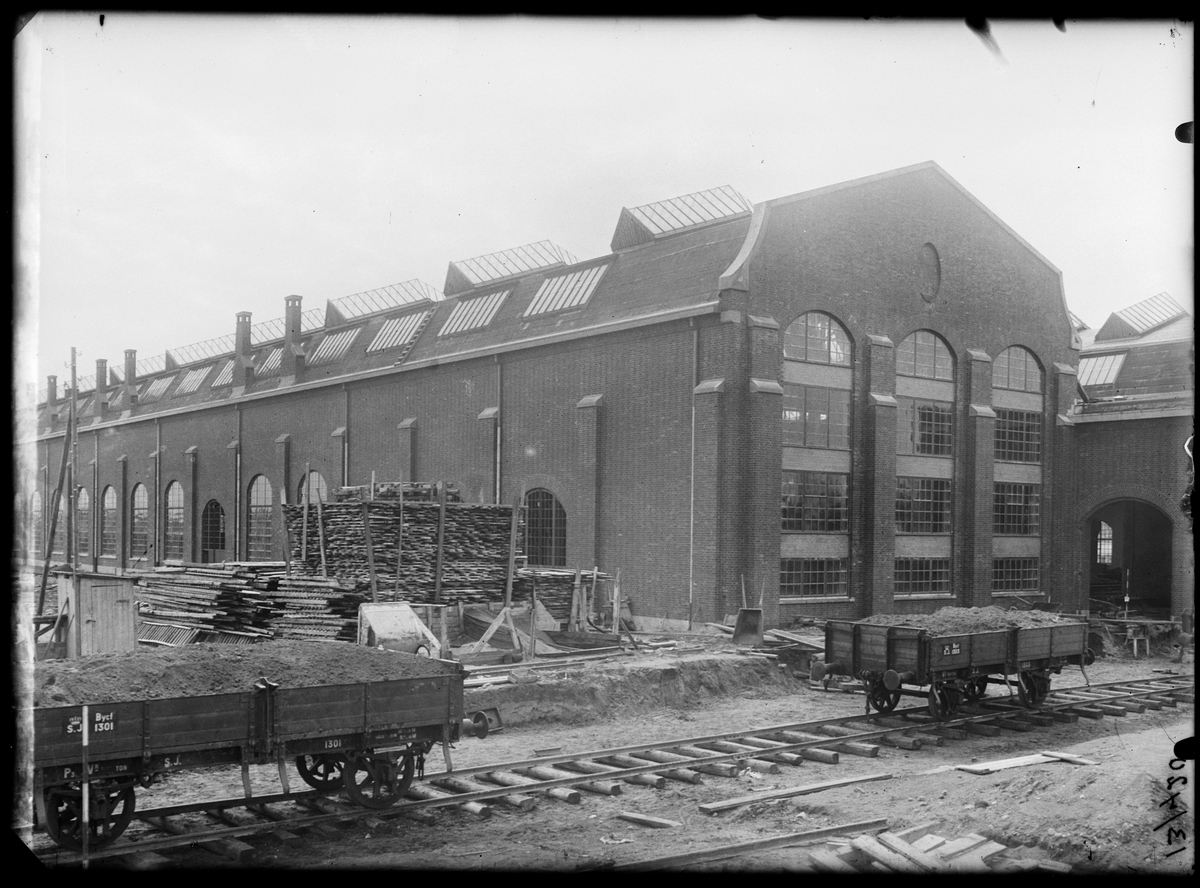 Byggnation av lokverkstaden vid Statens Järnvägars Järnvägsverkstäder i Kirseberg, Malmö.