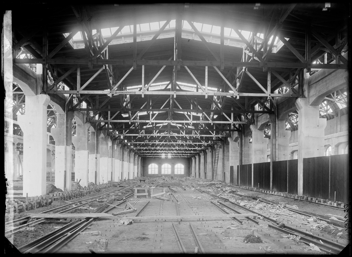 Byggnation av lokverkstaden vid Statens Järnvägars Järnvägsverkstäder i Kirseberg, Malmö.