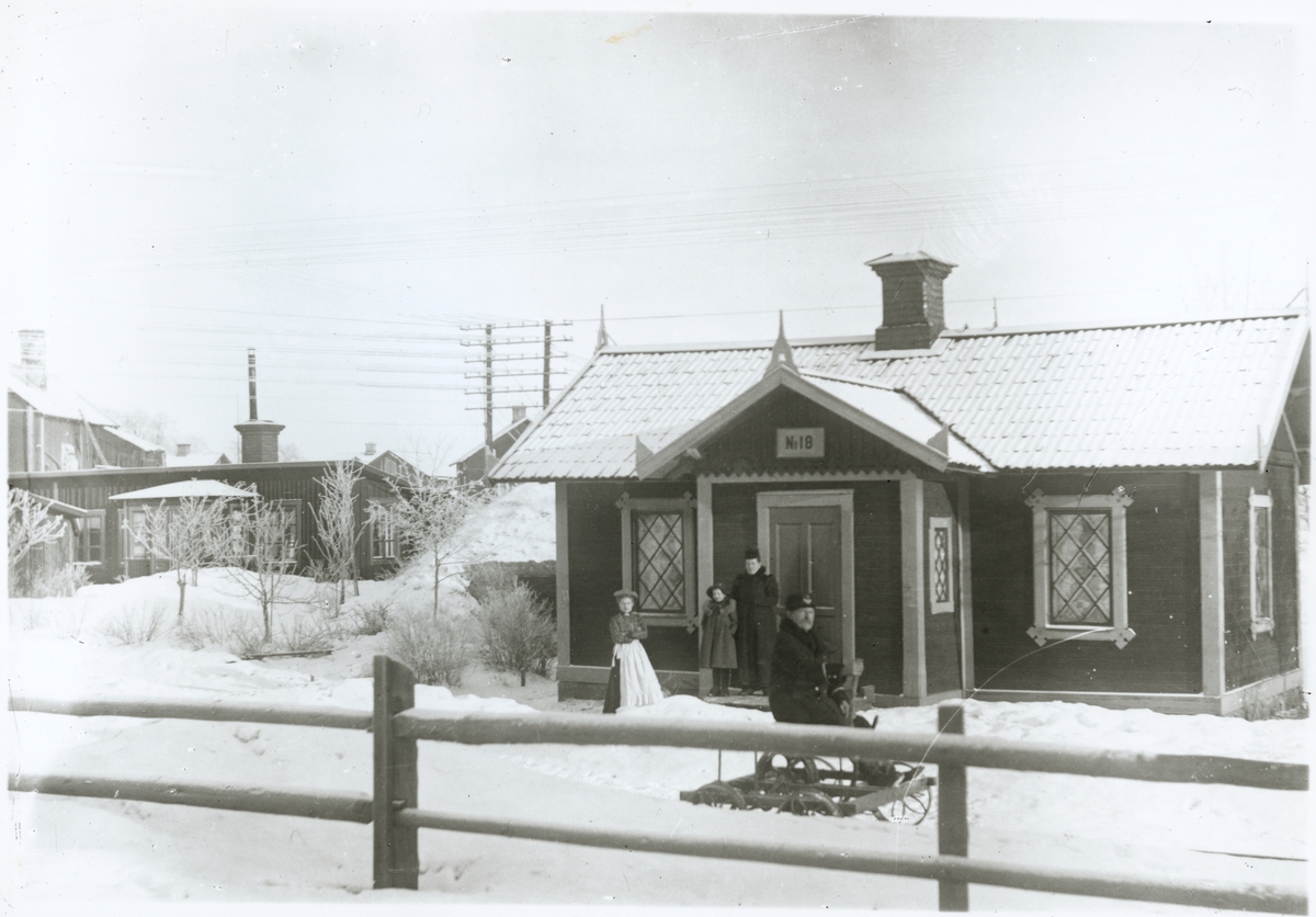 Titel: Personal med dressin och familj utanför banvaktstuga.