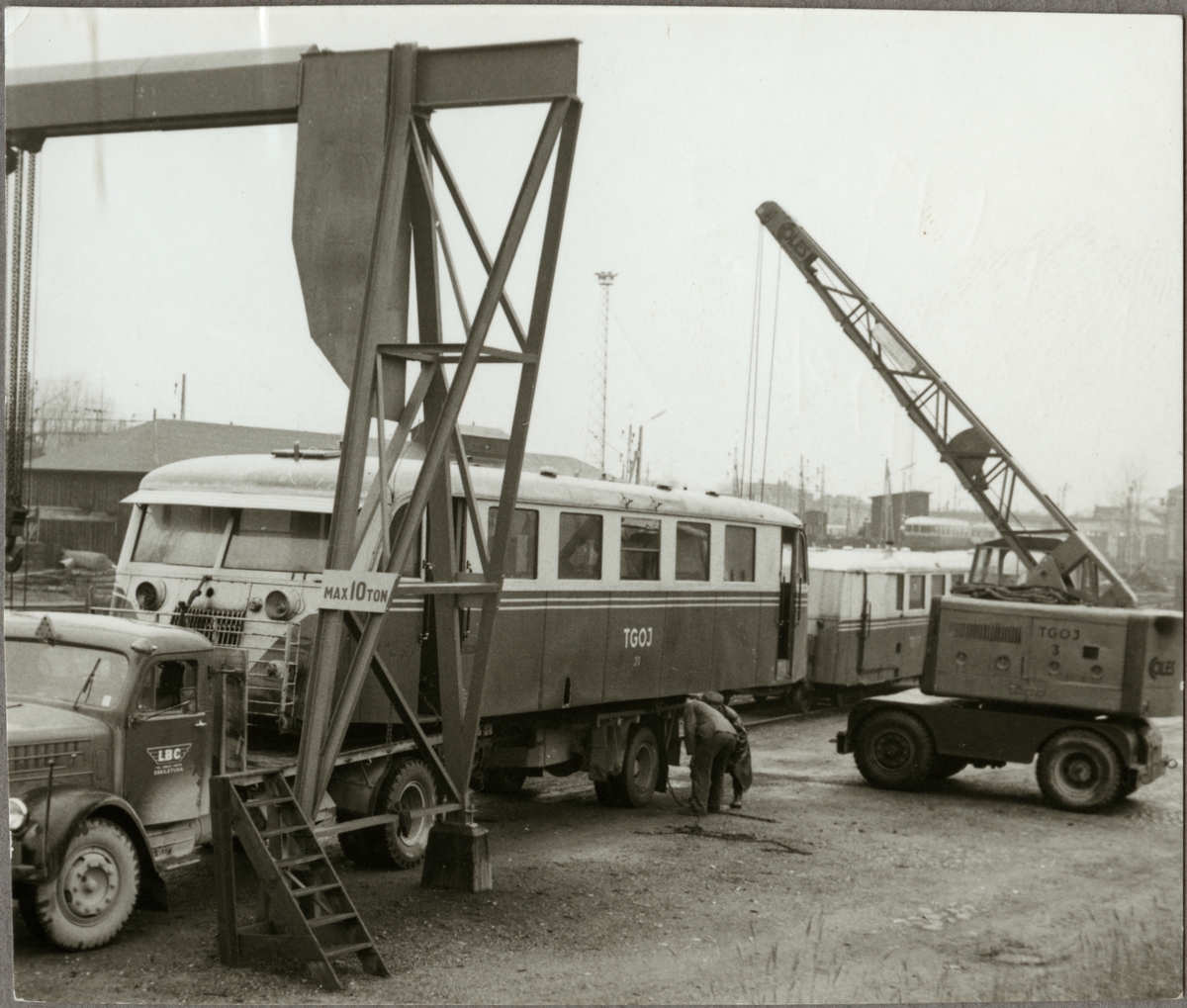Lastning av Trafikaktiebolaget Grängesberg - Oxelösunds Järnvägar, TGOJ YB0t 20 rälsbuss på lastbil med hjälp av kran.