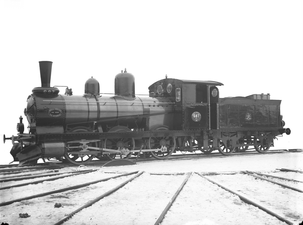 Statens Järnvägar, SJ Kd2 687. Ånglok på vändskiva. Loket tillverkades av Motala Verkstad och hade högsta hastighet 60 km i timme. Leveransfoto.