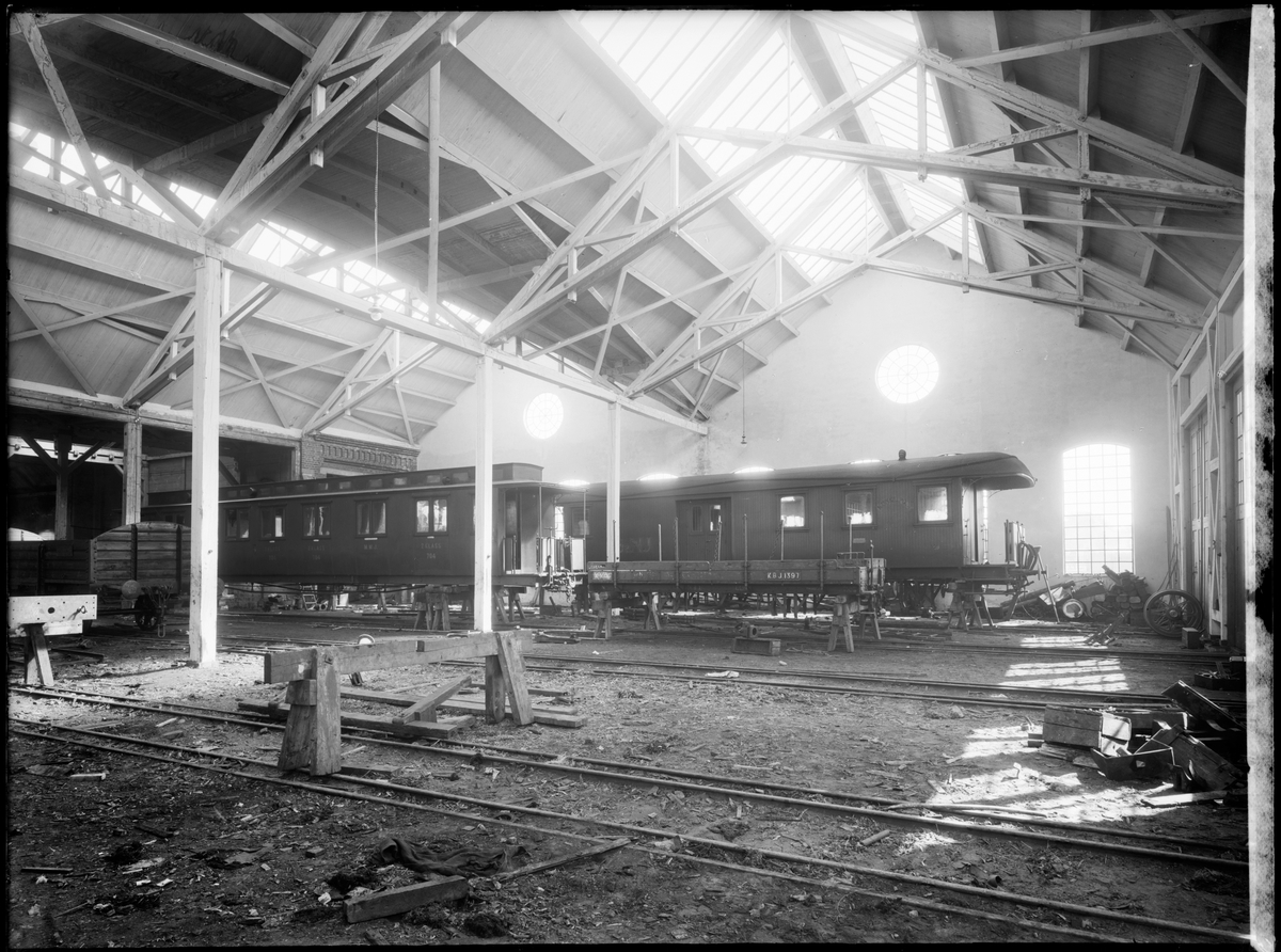 Interiör vagnverkstaden vid Kalmar Verkstad AB. Bland fordonen syns Mariestad - Moholms Järnvägs 3:e klass personvagn, MMJ BC0 704, Kalmar- Berga Järnväg, KBJ N 1397 och Sävsjöström - Nässjö Järnväg, SäNJ DF.