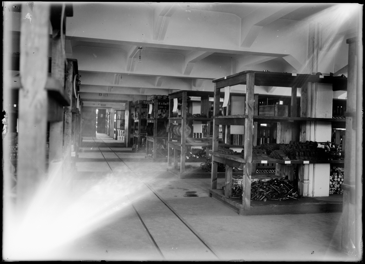 Interiörbild från huvudförrådet vid Järnvägsverkstäderna i Malmö. Beläget i stadsdelen Kirseberg.
