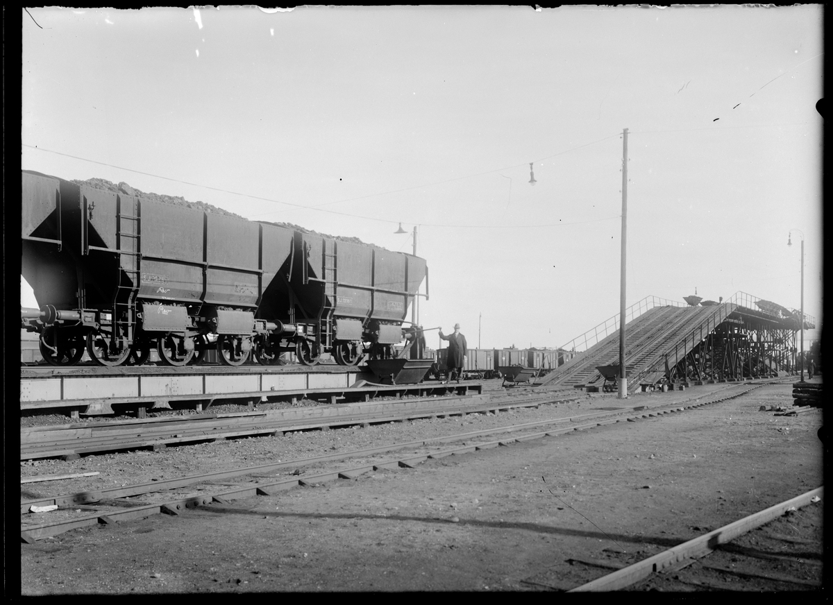 Kolvagnar och kolbrygga på bangården vid Malmö centralstation.