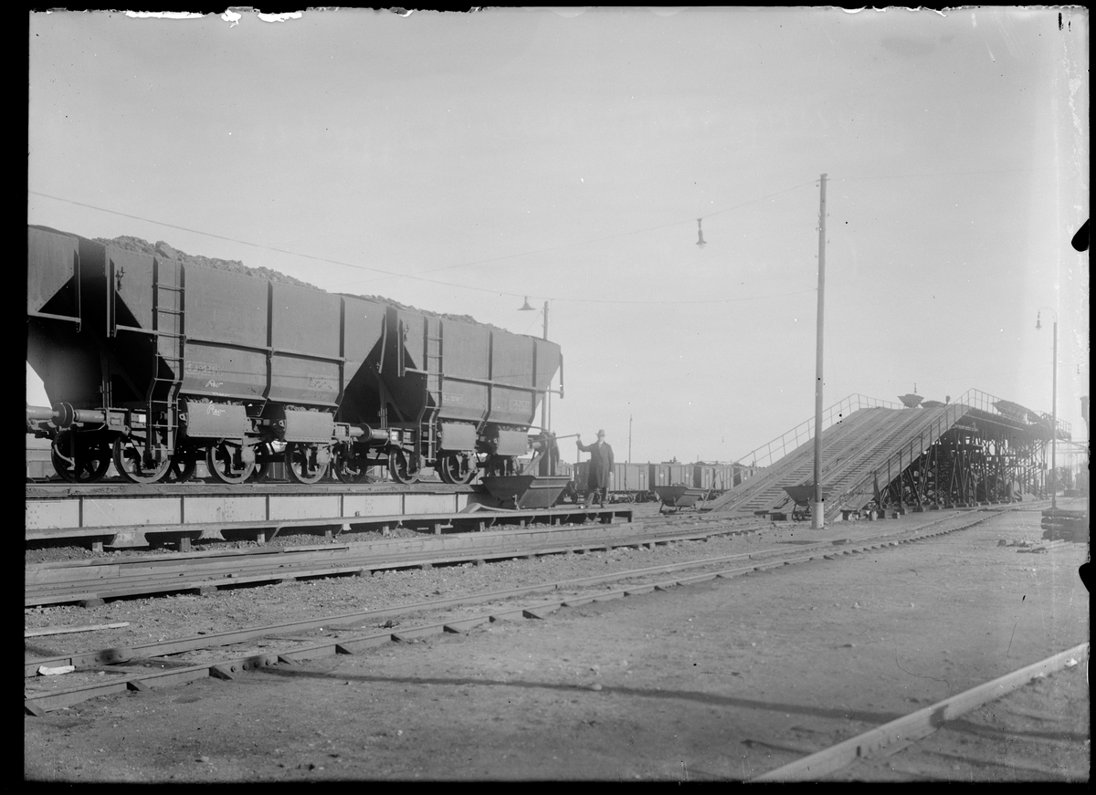 Kolvagnar och kolbrygga på bangården vid Malmö centralstation.