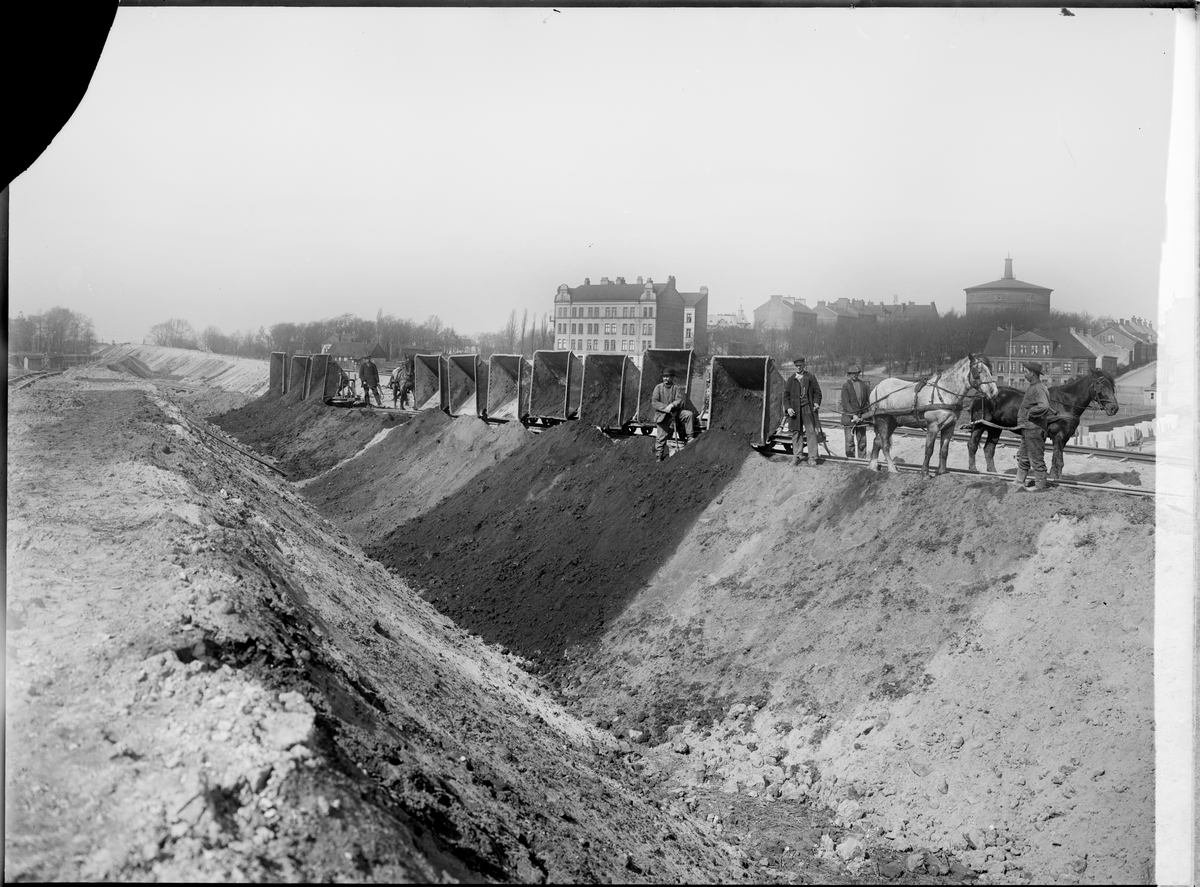 Bangårdsarbete vid Malmö centralstation. Hästdragna vagnar.