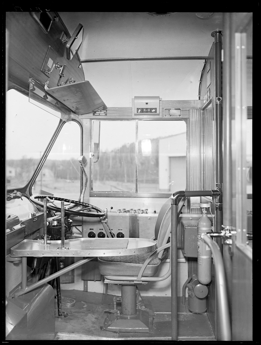 Stockholms Läns Omnibuss, SLO Enebyberg Buss 114. Bilden visar förarplatsen, omedelbart under ratten ser man växelväljaren, ovanför fönstret ser man förstärkaren för högtalaren. På sidan om förarplatsen ser man bordet för enmansbetjäning