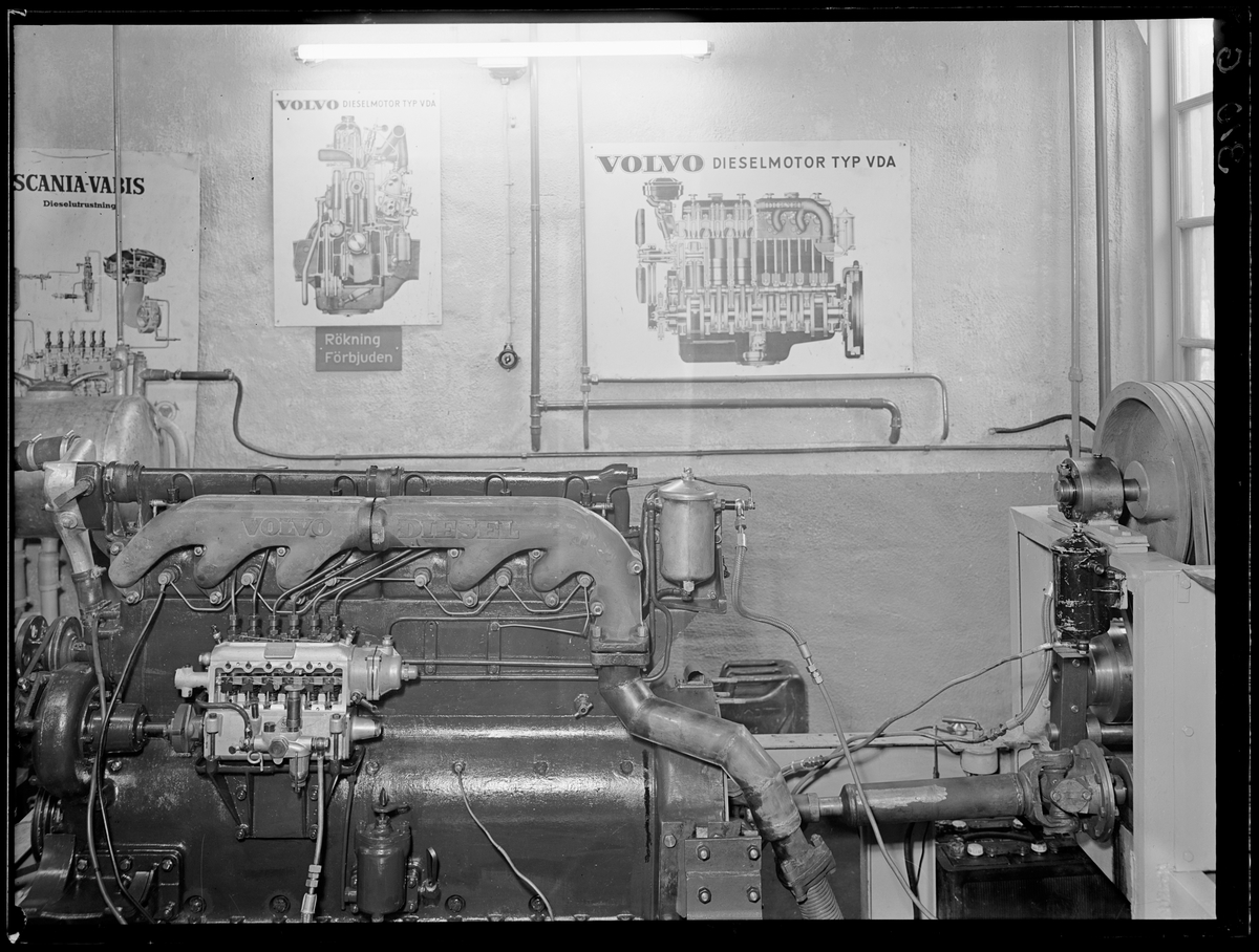 Stationär Volvodieselmotor inomhus. Provrum för motorer med bromsbänk.