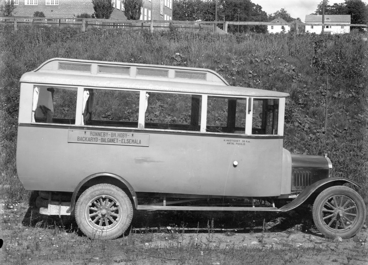 Titel: T-Fordbuss för Blekinge Kustbanor. Bussens högstahastighet var 30km i timme.