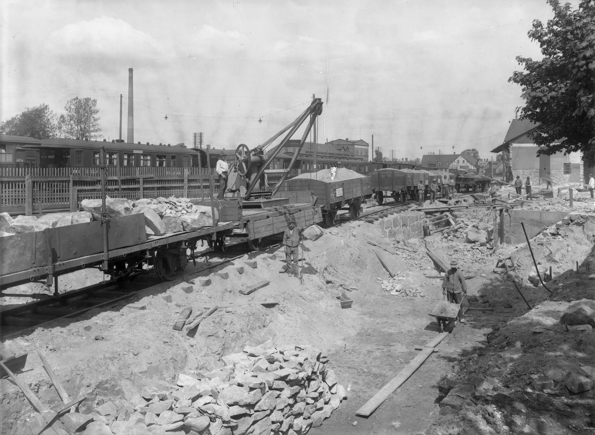 Statens Järnvägar, SJ kranvagn och SJ I1 4571 lådvagn, med flera. I bakgrunden syns AB Hässleholms Verkstäder