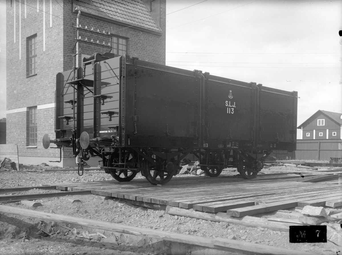 Spånga - Lövsta Järnväg, SLJ I 113. Sopvagn med bromssits högst upp på gaveln. Svenska Järnvägsverkstäderna, ASJ