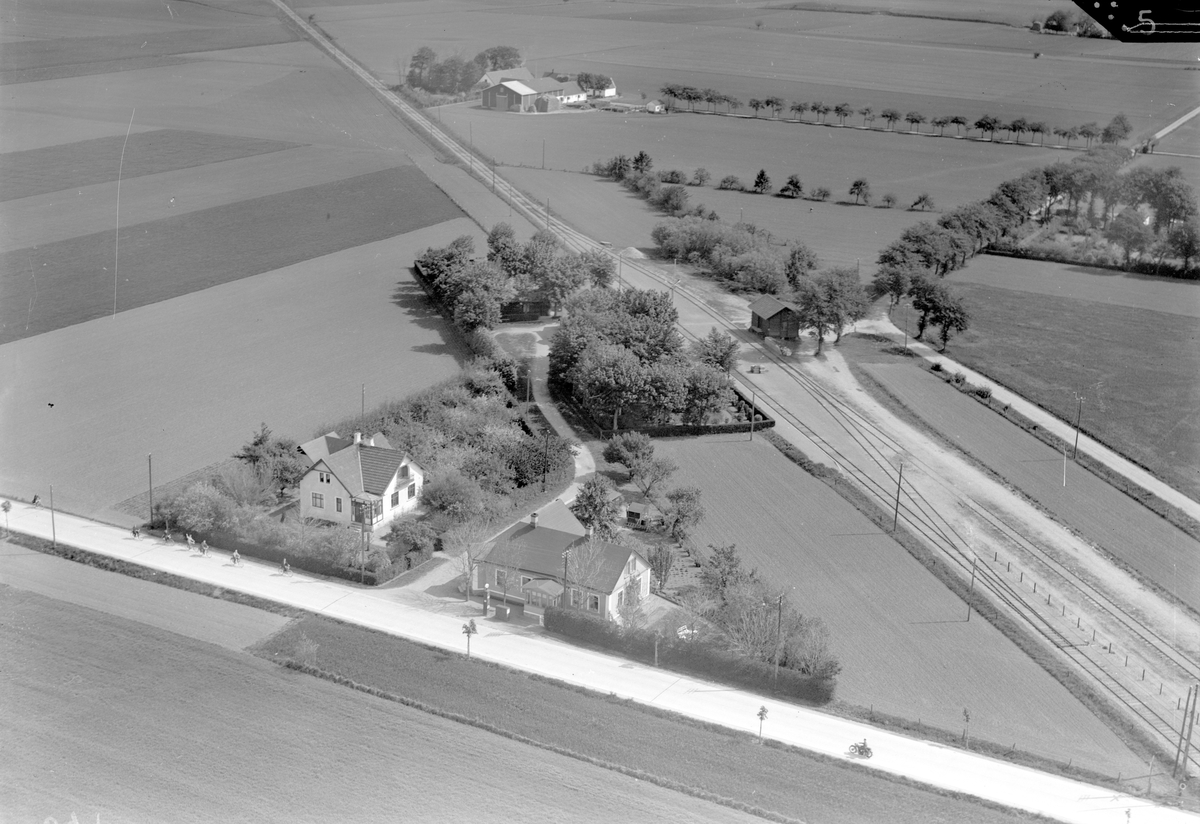 Stationen med jordbrukslandskapet i bakgrunden. Flygfoto.