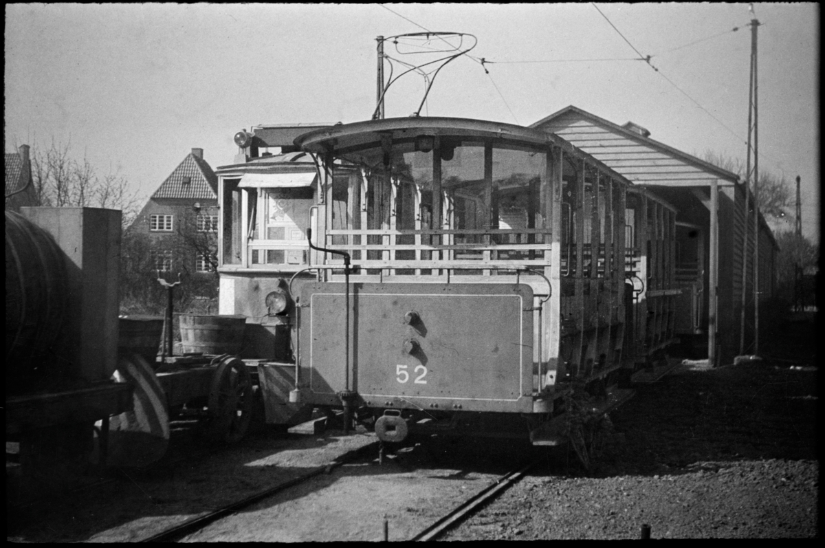 Framför gamla vagnsskjulet i Odense står grönmålade A/S Odense Elektriske Sporvej, OES öppen släpvagn 52.