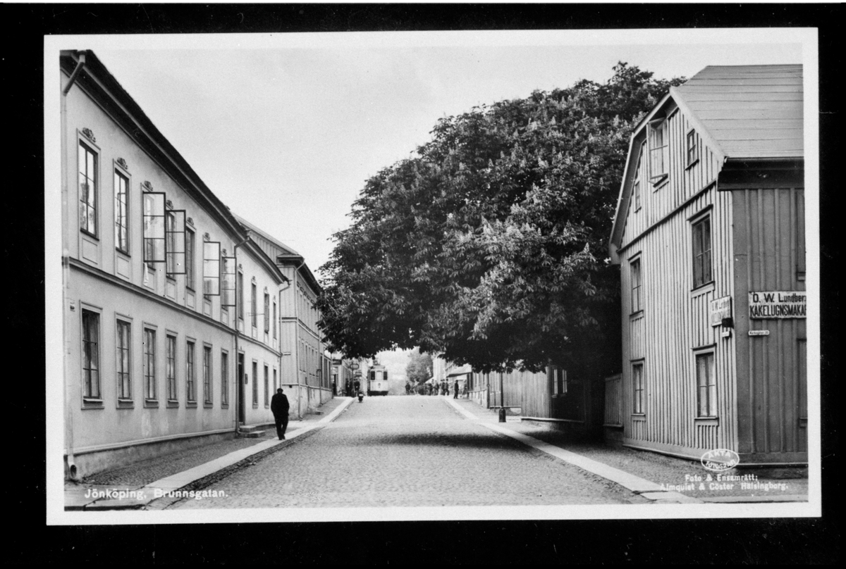 Vy på Brunnsgatan i Jönköping med ett kastanjeträd hängande över vägen.