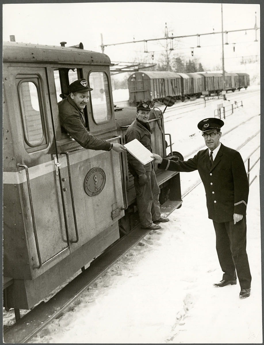Stationsmästare Gunnar Fredriksson vid Hälleforsnäs station tar emot frakthandlingar från AB Järnförädling. På lokomotorns fotsteg står Gunnar Engvall. Trafikaktiebolaget Grängesberg–Oxelösunds Järnvägar, TGOJ Z4 9.