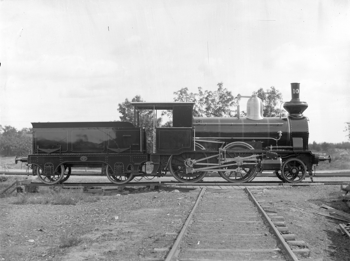 SHJ lok 10. Leveransfoto. Ånglok på vändskiva. Fick namnet Lagan. Loket tillverkades av Nohab. Skrotades 1928.