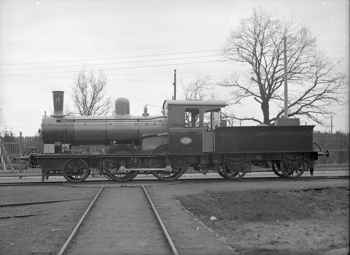 L&HJ lok 17. Leveransfoto. Ånglok på vändskiva. Loket tillverkades av Nohab. Skrotades 1945.