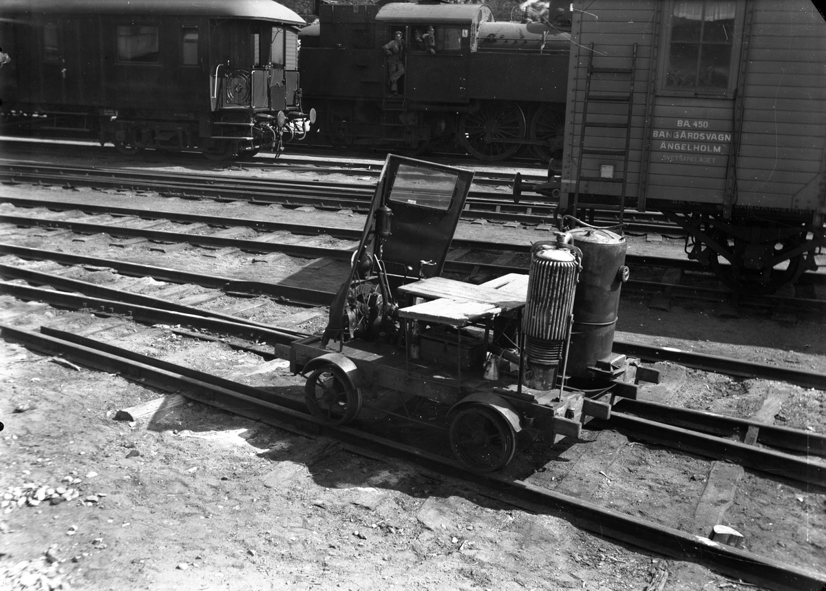 Statens Järnvägar, SJ motordressin med gengas på Ängelholms bangård. I bakgrunden syns en äldre personvagn, ett ånglok samt bangårdsvagn SJ BA 450.
