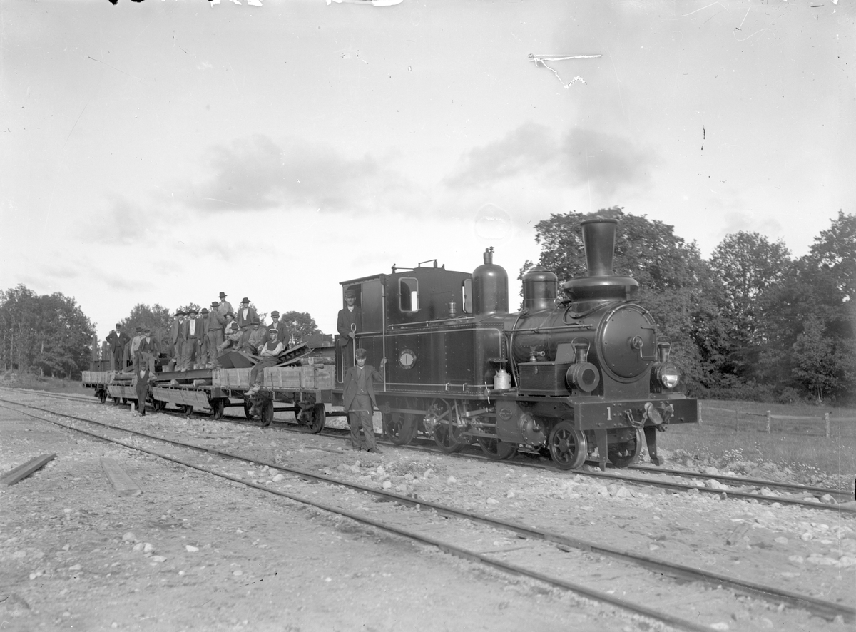 ROJ lok 1 med arbetståg. Rallare på vagnen. Verksamhets och miljöbild.