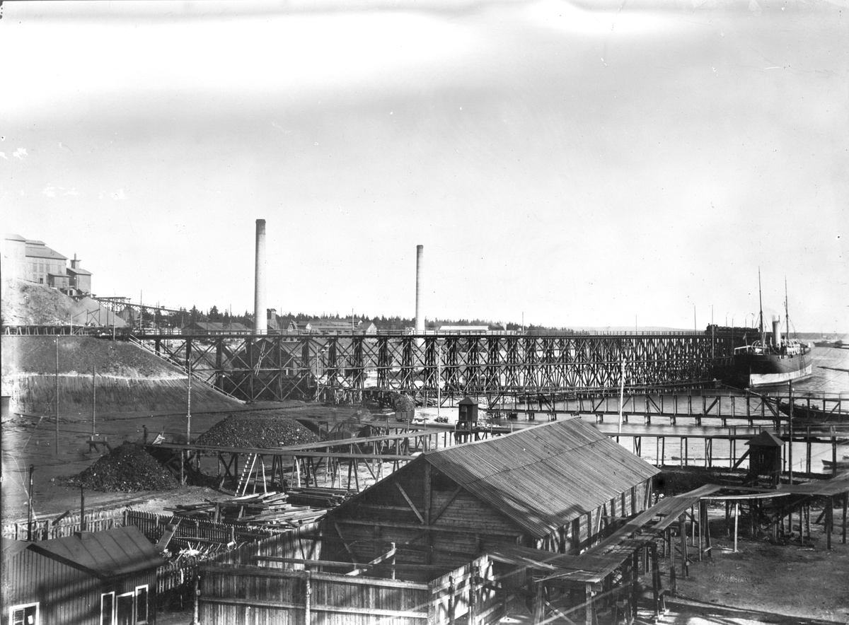 Malmlastningsbryggor i första utbyggnadsstadiet. Svartön