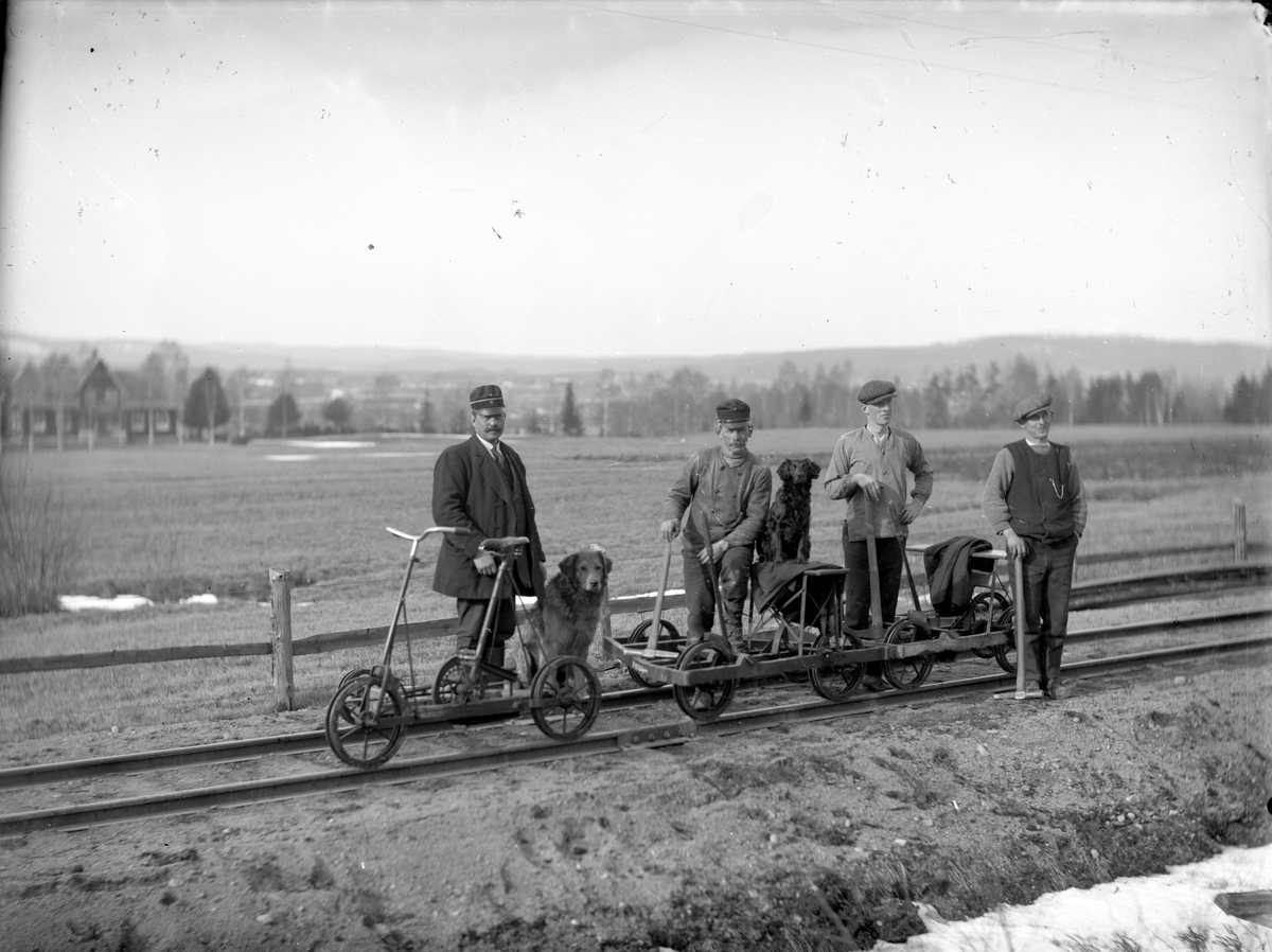 Nordmark-Klarälvens Järnvägars cykeldressiner. Personal med hund.