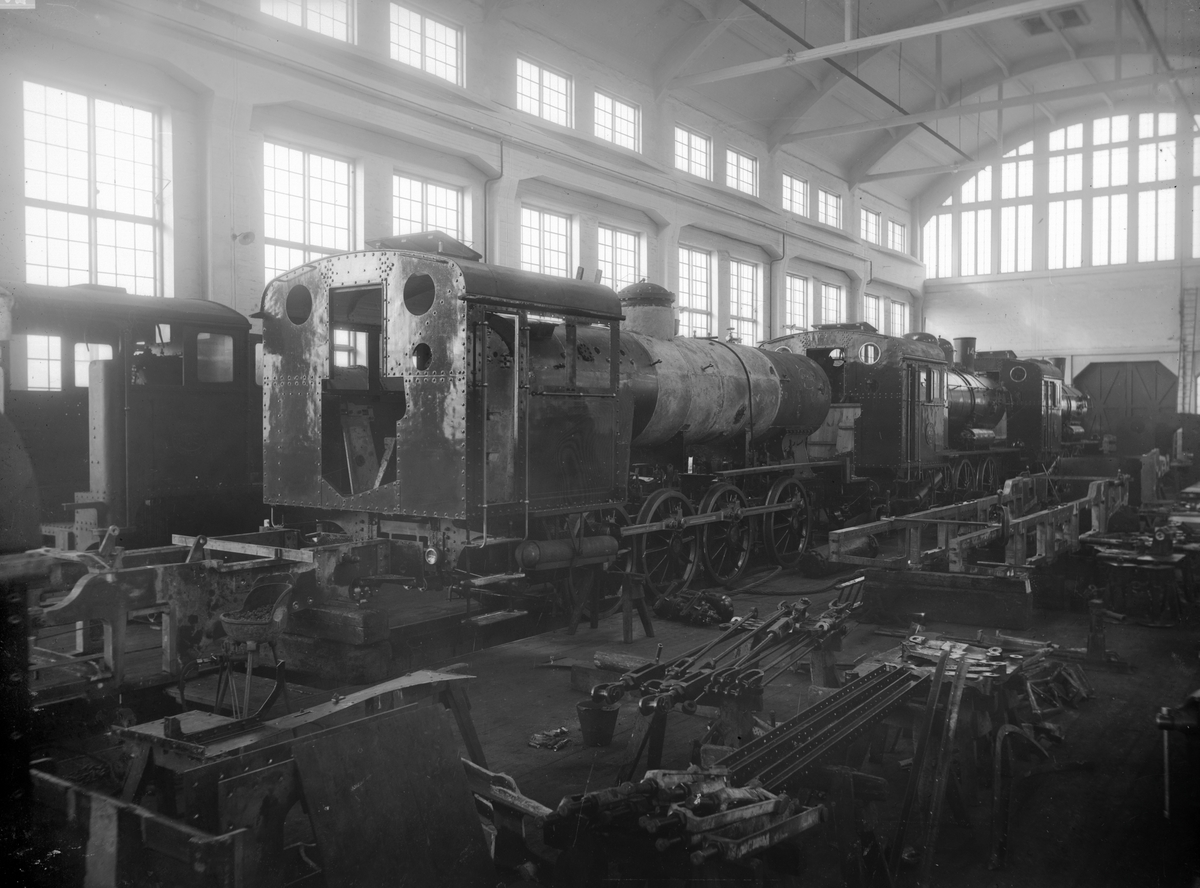 Statens Järnvägar, SJ E 1457 Loket visas under montering på Motala Verkstad.