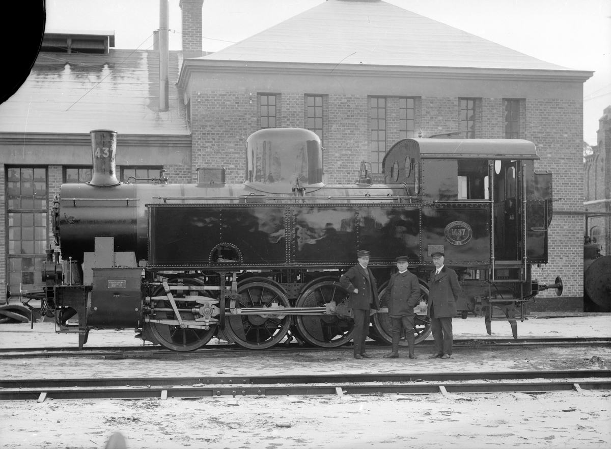 Statens Järnvägar, SJ N 1437. Loket tillverkades av Nohab och hade högsta hastighet 45 km i timme. Bilden är troligen tagen vid leveransen. Loket slopades 1973.