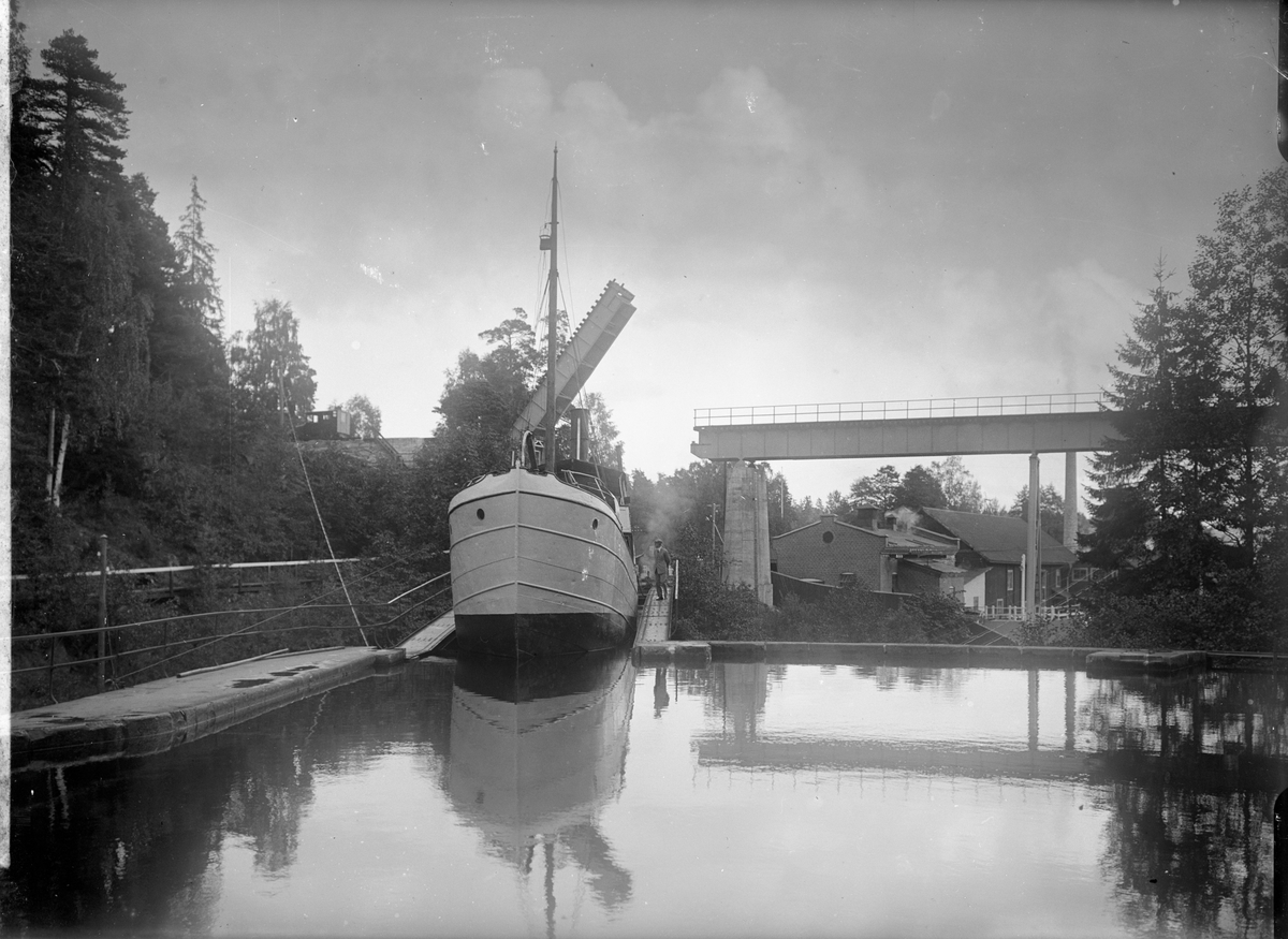 Akvedukten i Håverud med ett fartyg och en järnvägsklaffbro över kanalen. Akvedukten som färdigställdes år 1868 är en kombination av en landvägsbro, järnvägsbro och en akvedukt.