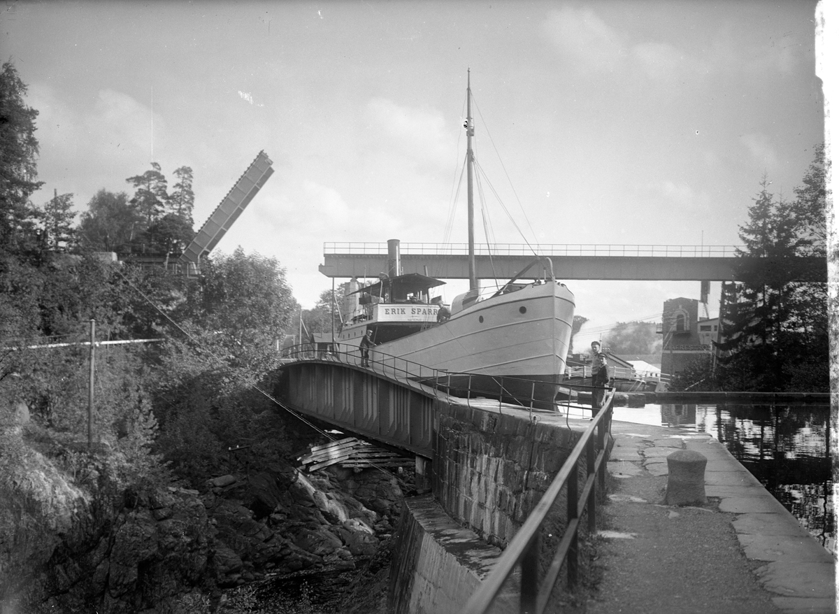 Akvedukten i Håverud som färdigställdes år 1868 är en kombination av en landvägsbro, järnvägsbro och en akvedukt. Ett fartyg passerar genom en vattenbro. Bakom syns en järnvägsklaffbro.